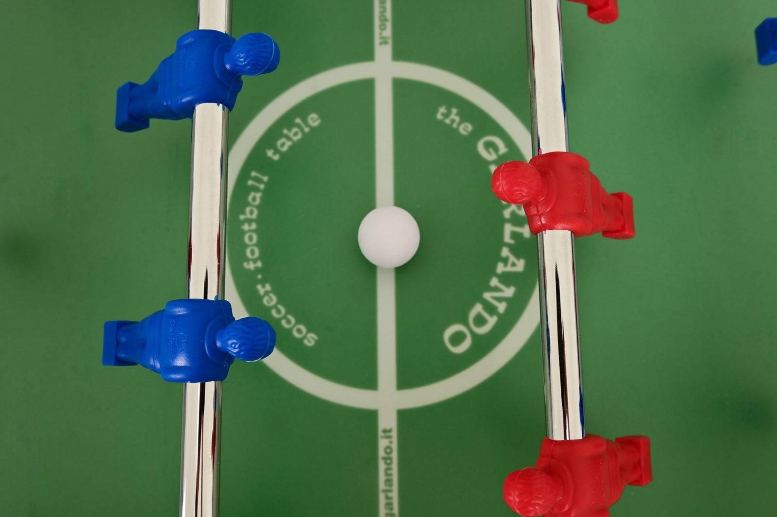 Turneringsbord fra Garlando med 16 mm gennemgående solide stålstænger med anti-rust forkromning. Bordets stænger er udstyret med stål kuglelejre, 360 graders roterende målmand, stødfangere af naturgummi. Bordet er lavet af MDF for at opnå en ekstrem robusthed.