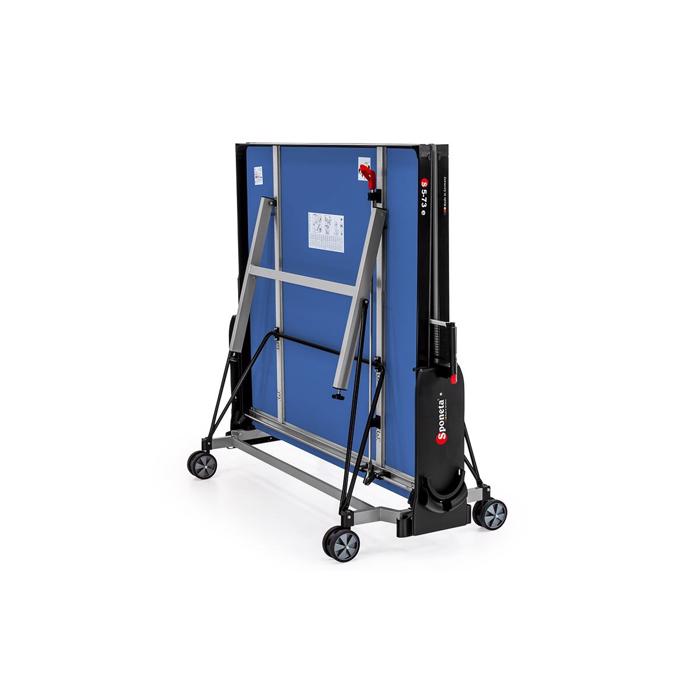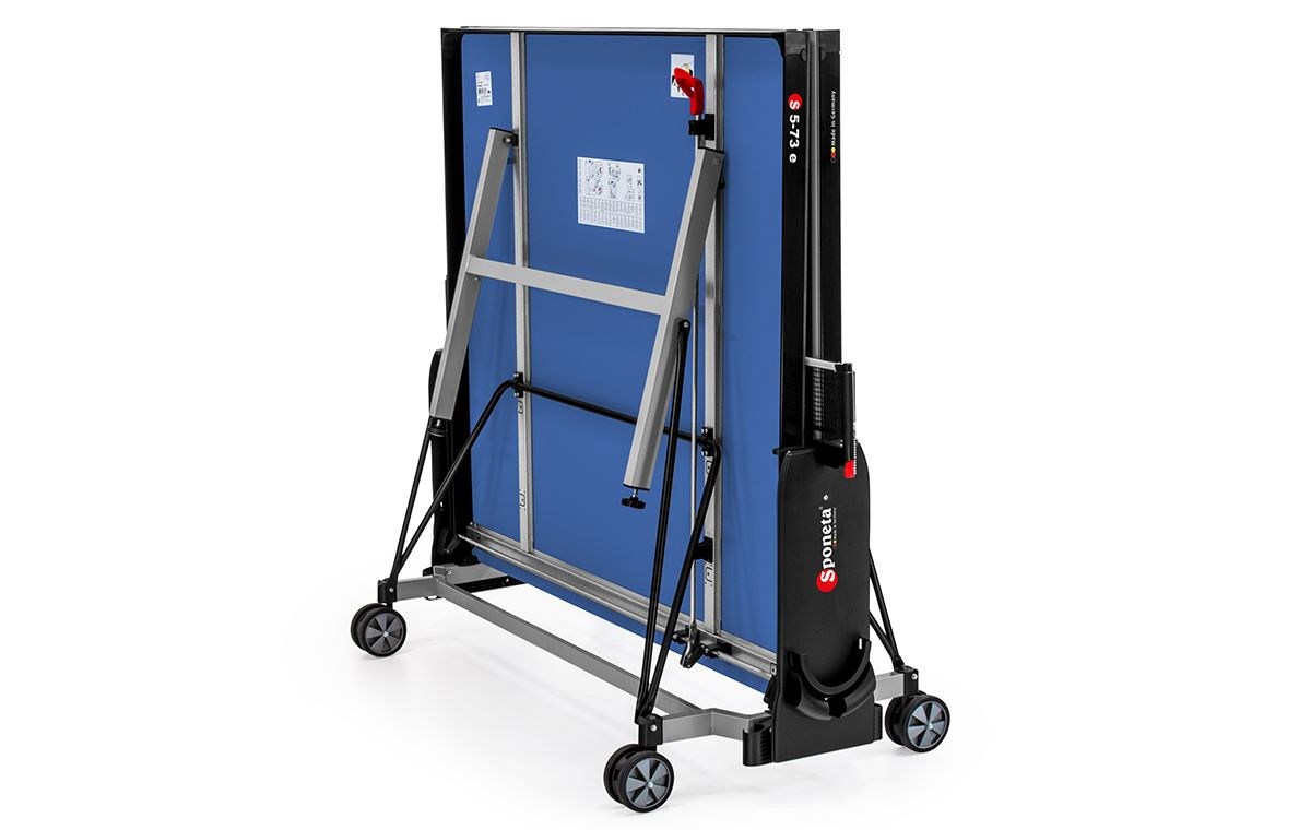 Bordet kan klappes sammen for nem og praktisk opbevaring. På Sponeta School Line bordtennis sikrer sikkerhedsbeslag at pladerne er fastlåst under opbevaring.