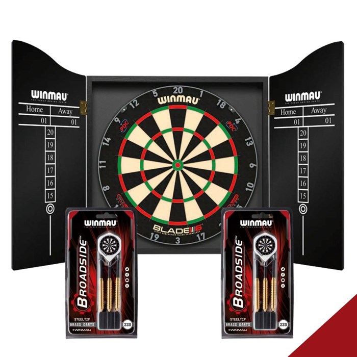Blade 6 homesæt plus med dartskab, dartskive og 2 sæt dartpile - alt hvad du behøver i ét sæt. Sættet er sammensat til dig, der vil have et rent og lækkert dart-setup derhjemme: Du får et stilrent dartskab, den populære Winmau Blade 6 bristle dartskive og 2 sæt Winmau Broadside brass steeltip dartpile.Varenr.: W3033X