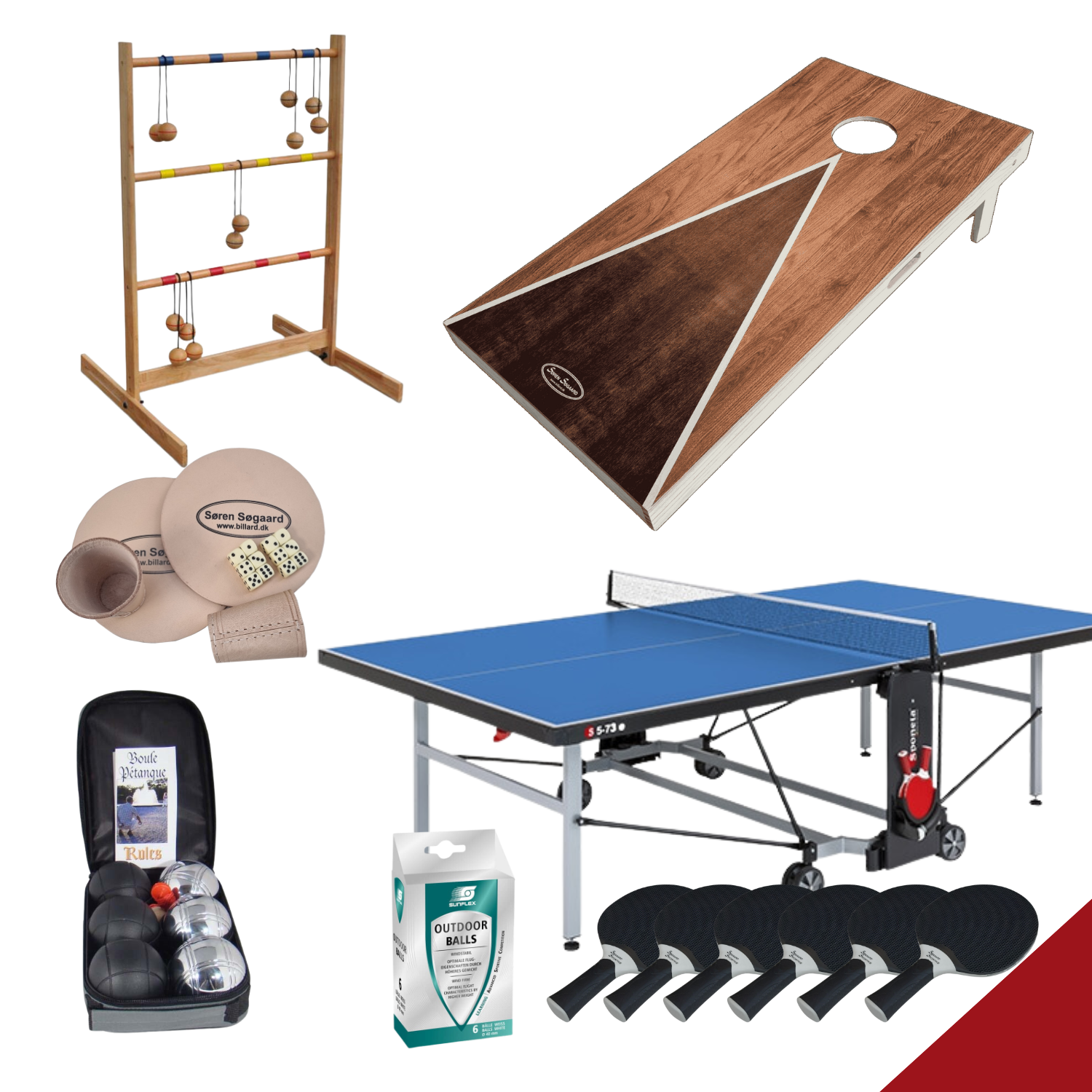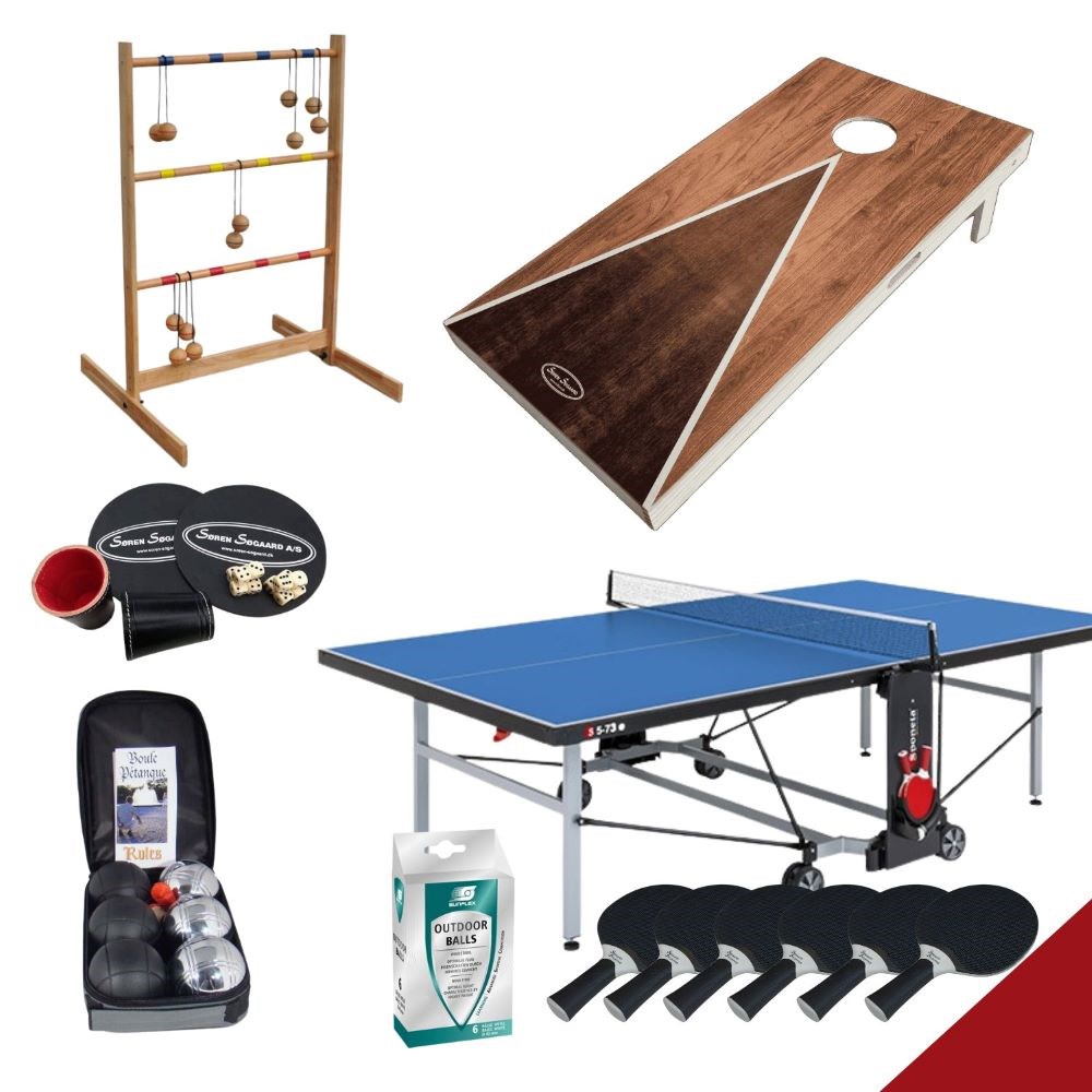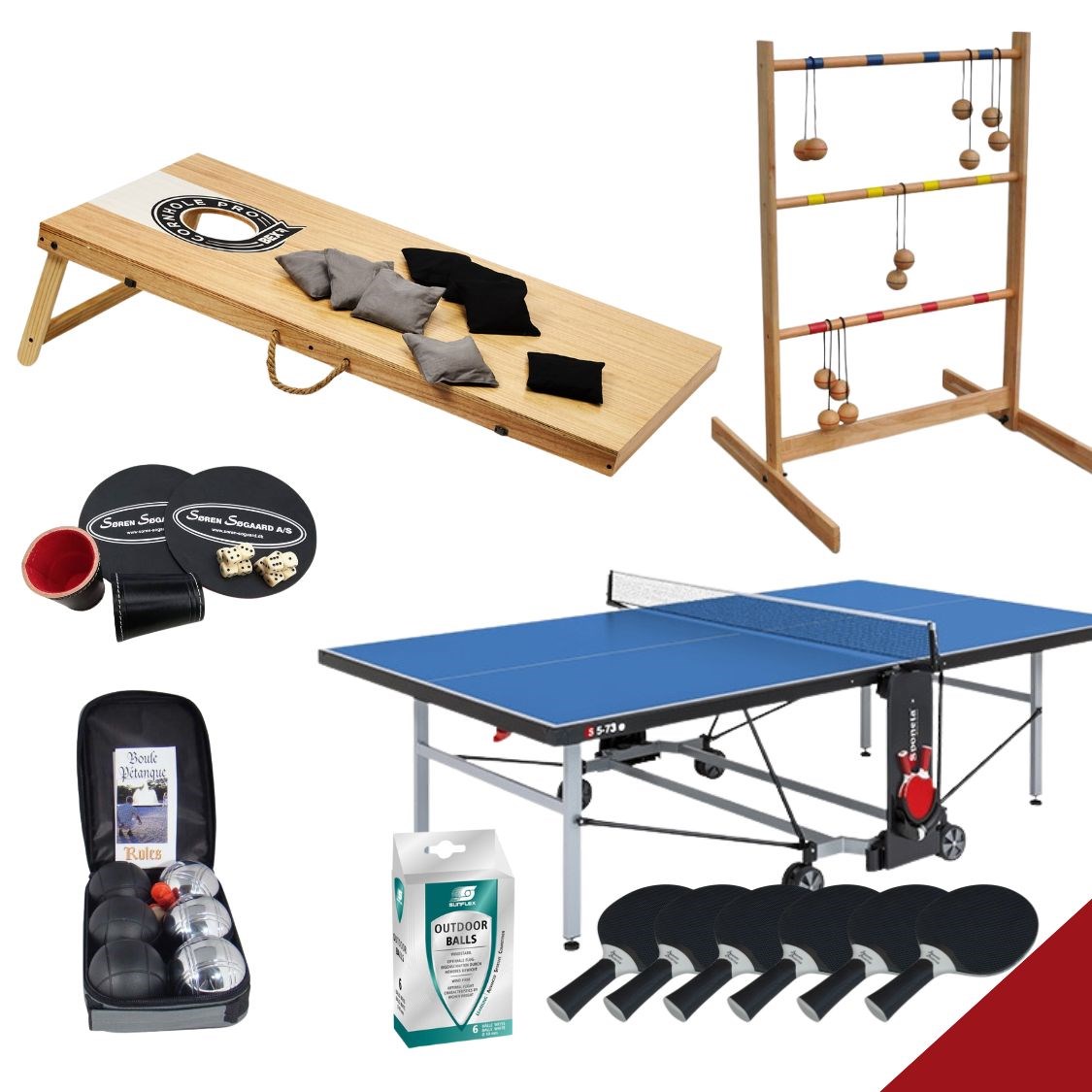 Lækker Premium pakke med havespil til sommerfesten, studenterfesten etc. Pakken indeholder spil til mange timers sjov og hele 5 spil: Bordtennis, cornhole, stigegolf, petanque og raflesæt.