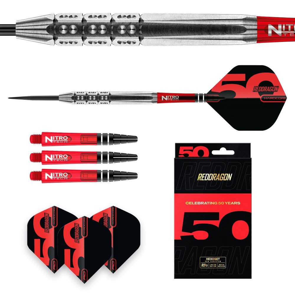 Pilen kommer med Hardcore extra thick standard flight og Red Dragon 50 years shafts i short.
