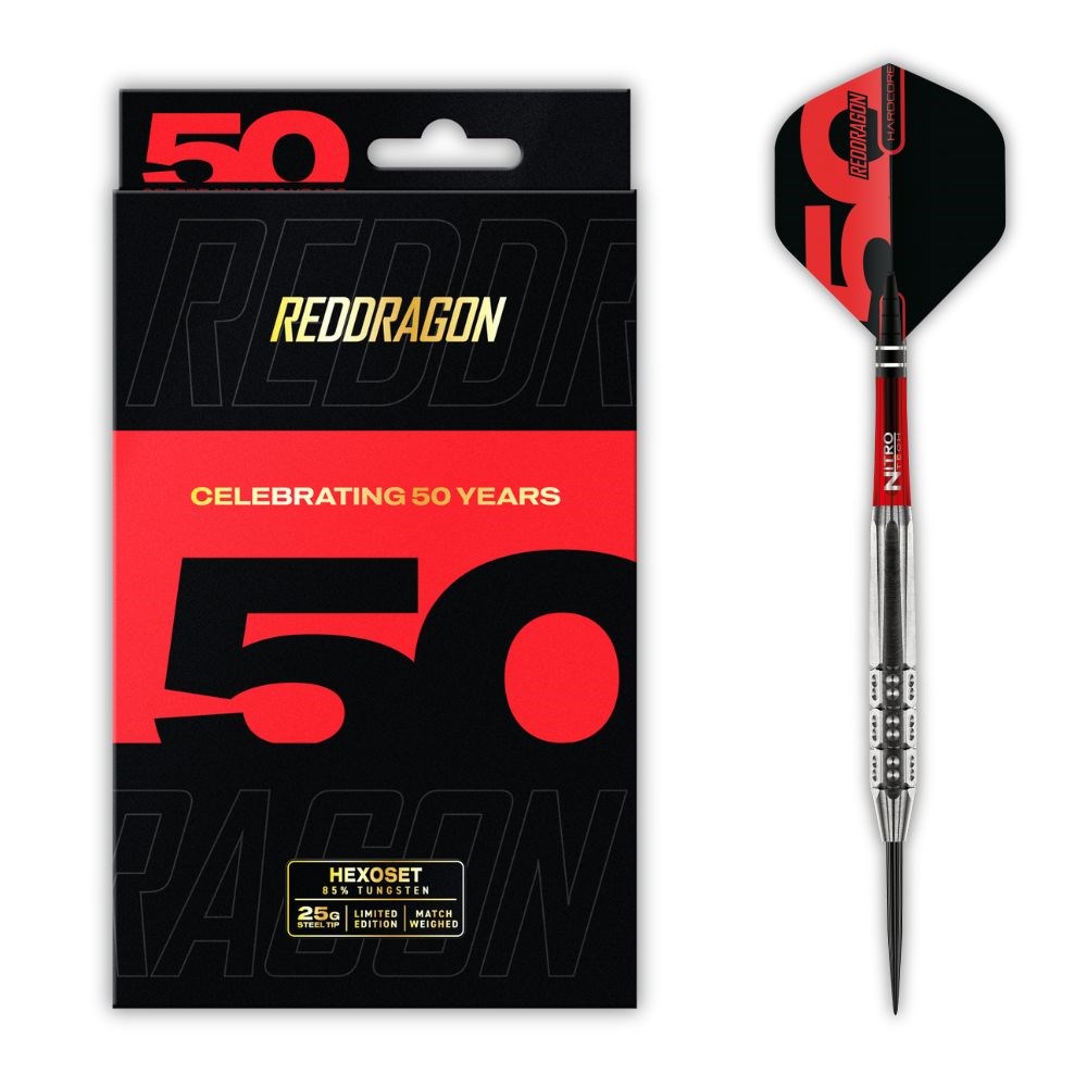 Fronttung kraft møder præcisions¬ingeniørkunst i Hexoset 3. Formet i en torpedo-profil og afsluttet i poleret, naturlig tungsten. Det unikke Hexoset-greb dominerer både de forreste og centrale zoner. Sorte high-tensile spidser fuldender pilen. Skabt til spillere, der trives med et fast, konsistent greb. Varenr.: RD0491-50