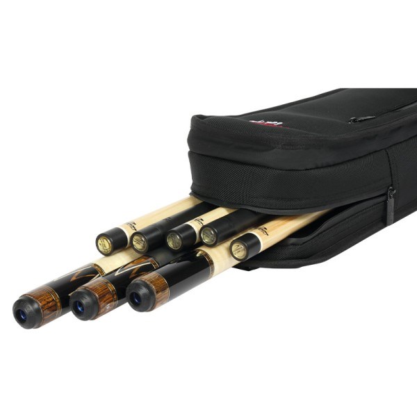 Kø-tasken kan rumme 3 bundstykker og 5 spidser, og der er en stor udvendig lomme til opbevaring af kridt, handsker, forlænger mm.