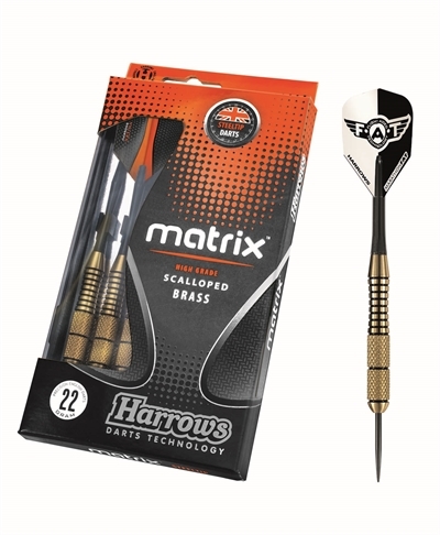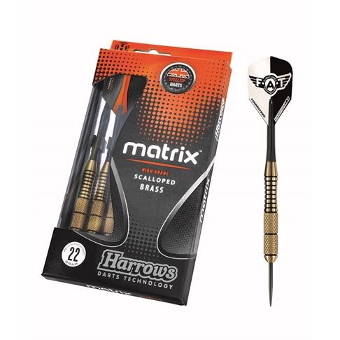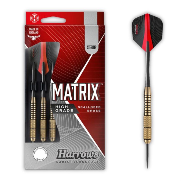 Matrix er en fin pil med messing bundstykke, sort nylon shaft og Hologram flights. Æsken indeholder 3 pile og der medfølger en ekstra tynd plastik æske til opbevaring og transportering af pilene.