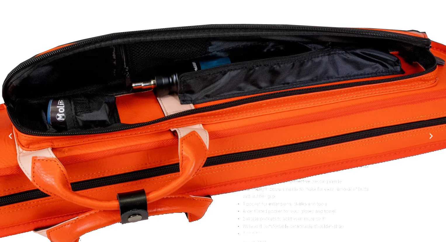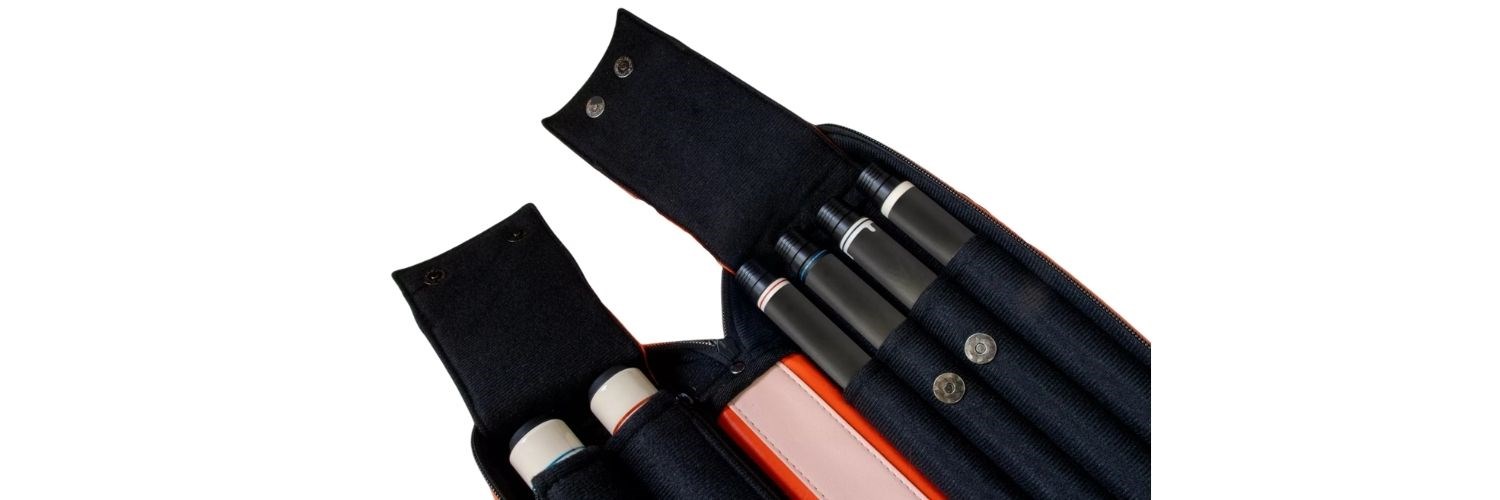 Tasken har plads til 2 bundstykker, 4 spidser og en forlænger. Derudover har tasken 2 udvendige lommer, 2 indvendige lommer, en ventilerende net-lomme til handsker. Tasken er yderst rummelig og der er god plads til kridt, værktøj, mobiltelefon etc.