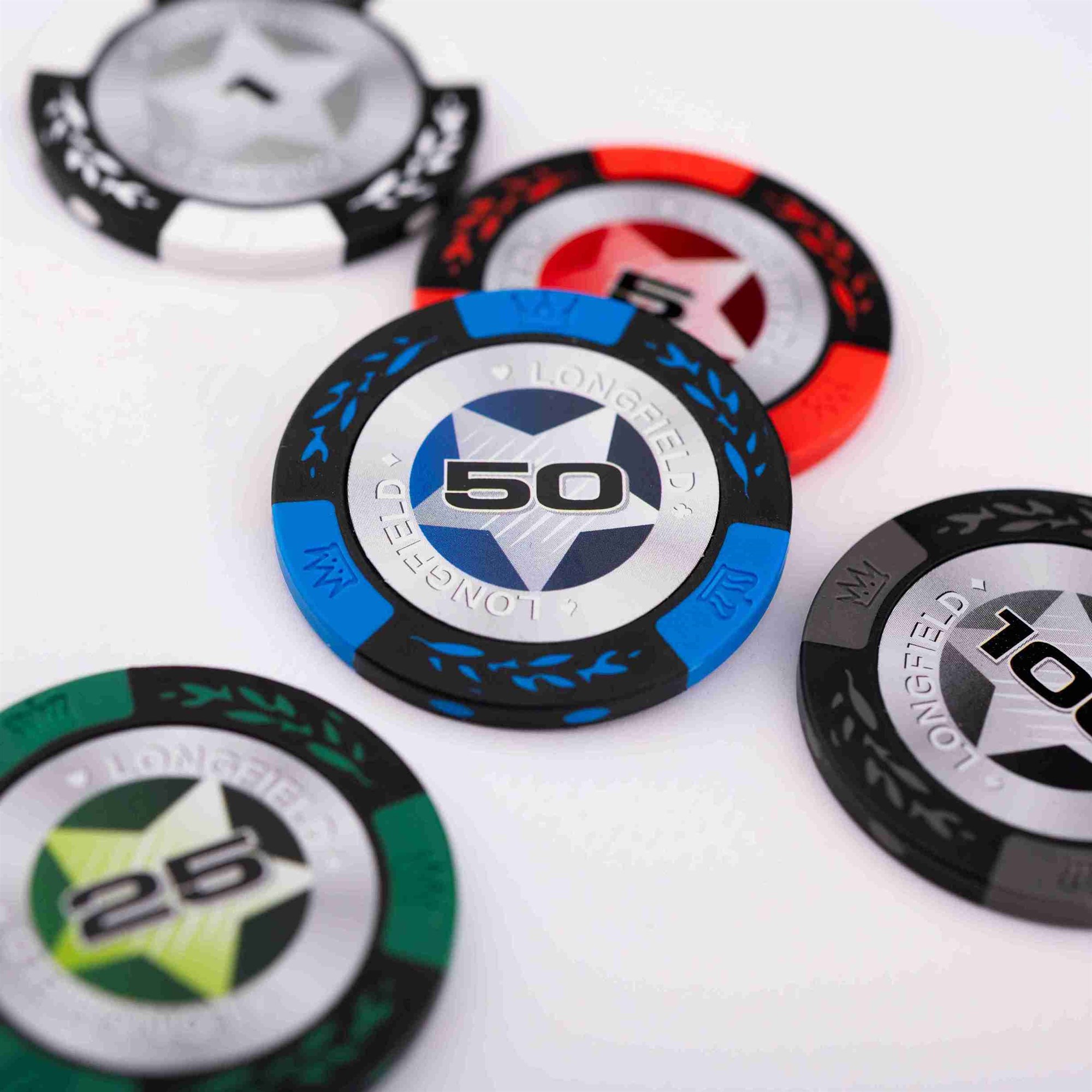 Spillet er med solide 14 grams chips fordelt med disse værdier:
