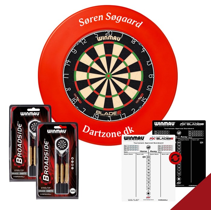 I denne pakke får du den ultra lækre Blade 6 dartskive, der er Winmaus turnerings dartskive i den absolutte topklasse. Derudover får du en rød kvajering, 2 sæt dartpile samt en Winmau Dry & Wipe scoreboard inkl. tusch. Beslag til ophæng af skiven medfølger.