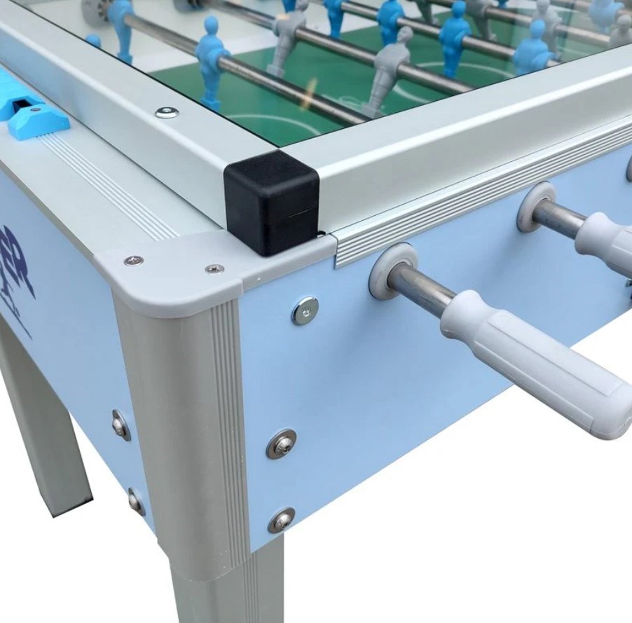 Dette bordfodboldspil er ligeledes udstyret med lyseblåt kabinet i flerlags krydsfiner og spilleflade af 5 mm hærdet glas, som modstår både fugt og sollys. På COVER modellen er der ligeledes en topglas plade, som lukker spillet således spilleflade og spillere skærmes for vind og vejr. Samtidig kører boldene i et lukket system, som gør at de ikke kan fjernes. Der medfølger 10 fodbolde.
