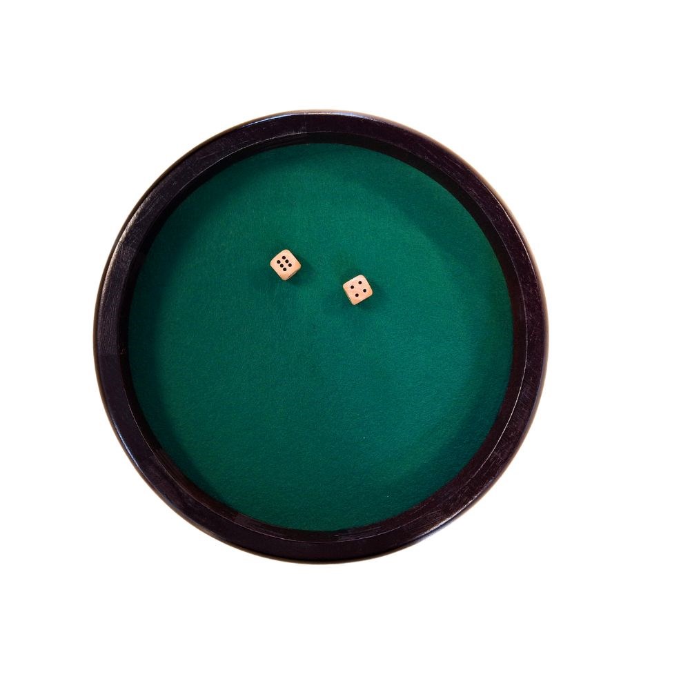 Praktisk terning bakke i gummitræ med grøn filt. Bakken har en diameter på 34 cm.