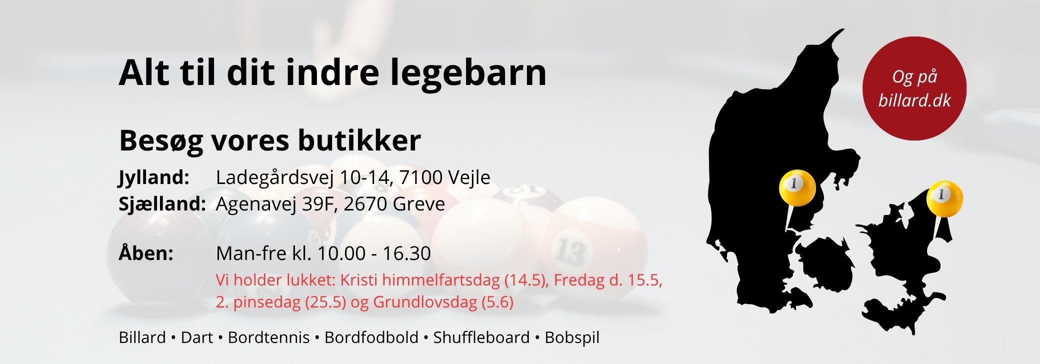 Kombinationen af vores fysiske butikker og webshop med onlinehandel skaber en skræddersyet oplevelse for dig som kunde, som gør at du kan tjekke dit billard, bordfodbold eller bordtennis ud på sitet her eller besøge én af vores fysiske butikker, for at se og røre produktet du er ude efter. Har du brug for hjælp eller gode råd, er du altid velkommen til at kontakte os på telefon 7013 1333 eller mail info@billard.dk, så sidder vores dygtige personale klar til at vejlede dig. Vores garanti for Danmarks bedste service, billige priser på alle produkter, gode tilbud, hurtig levering, kvalitets produkter og professionel rådgivning - alle tingene finder du lige her!
